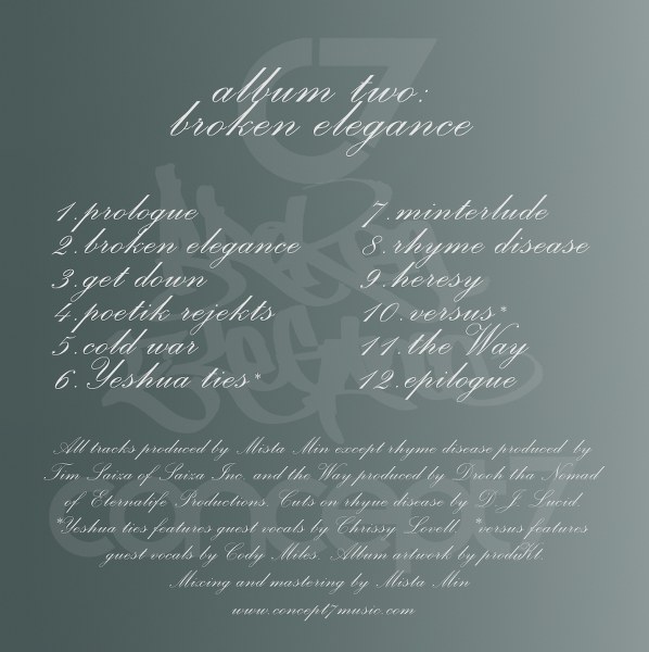 concept7 is back on the scene with album two: broken elegance. Featuring twelve brand new tracks with a more evolved and mature sound, intellectually stimulating, and fun to sing along with, broken elegance resonates with the mind and refreshes the heart and soul.